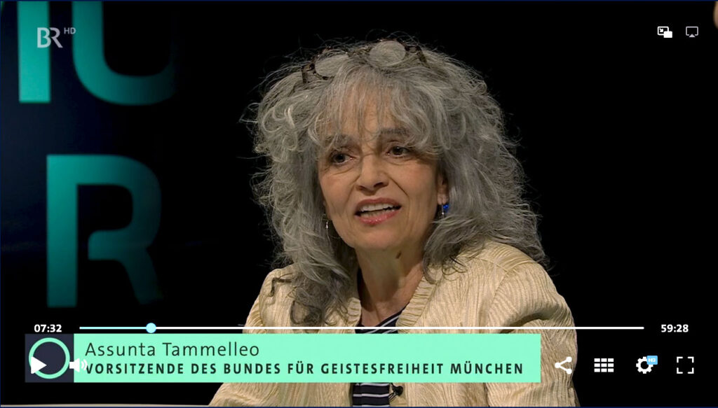 Über das Thema diskutierten der emeritierte Erzbischof von Bamberg Ludwig Schick, die evangelische Pfarrerin Stefanie Schardien, Heribert Prantl, Kolumnist der Süddeutschen Zeitung, und Assunta Tammelleo, Vorsitzende des Bundes für Geistesfreiheit München. Münchner Runde im Bayerischen Rundfunk am 05.04.2023:https://www.ardmediathek.de/video/Y3JpZDovL2JyLmRlL3ZpZGVvLzFkOTEyNDE1LThmZTItNGY5Ni1hZjZlLWNhMDgyY2U5MWEyZg