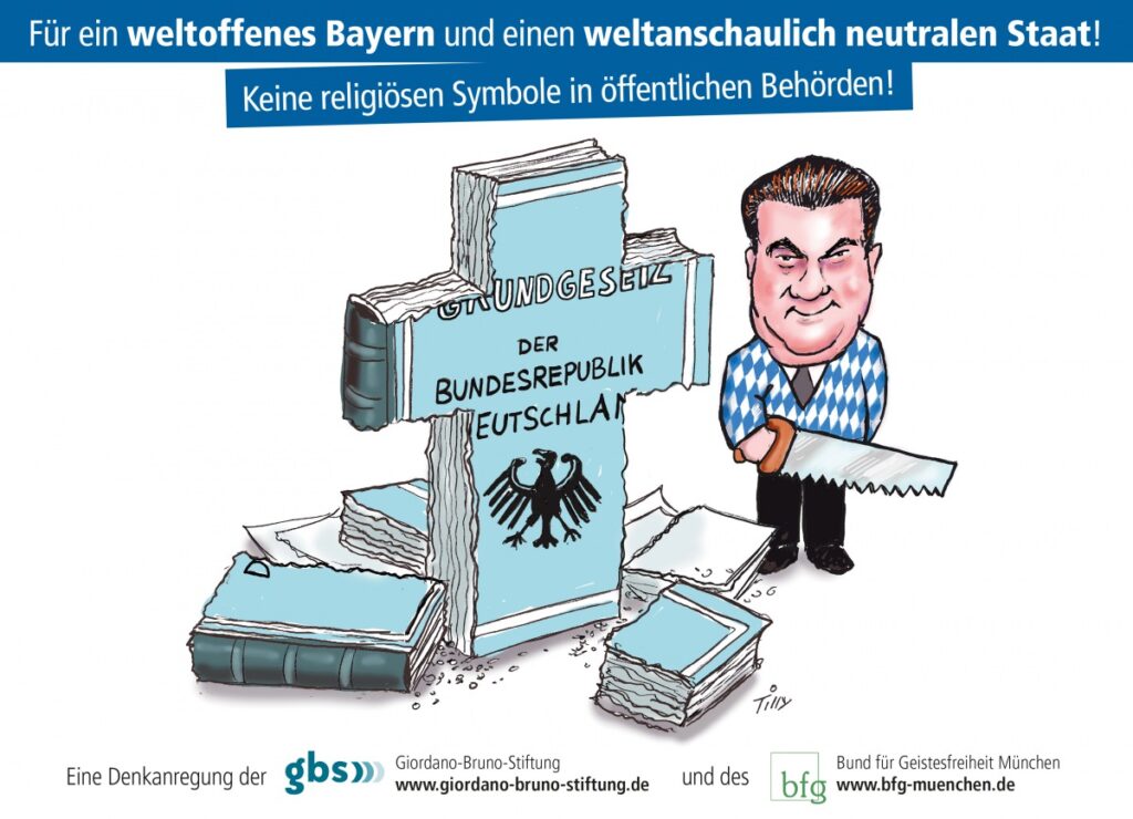 Kurz vor der Landtagswahl in Bayern wollen die Giordano-Bruno-Stiftung (gbs) und der Bund für Geistesfreiheit München (bfg München) an die Kreuz-Verordnung von Ministerpräsident Markus Söder erinnern, die am 1. Juni 2018 in Kraft trat. Aus diesem Anlass wird die oben abgebildete Karikatur des Düsseldorfer Künstlers Jacques Tilly in den kommenden vier Tagen unter dem Motto: […]