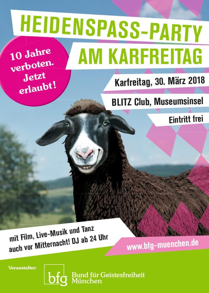 Laut Urteil des Bundesverfassungsgerichts vom 27. Oktober 2016 gilt das in einigen Bundesländern strikt verfolgte „Tanzverbot an Karfreitag“ nicht, wenn der Tanz „Ausdruck eines weltanschaulichen Bekenntnisses“ ist. Auf Grundlage dieses Urteils lädt der Bund für Geistesfreiheit München (bfg München) am 30. März 2018 zur Heidenspaß-Party in den Münchner BLITZ Club. Die Richter in Karlsruhe hatten […]
